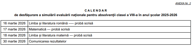 3. Calendarul simulării Evaluării Naționale – clasa a VIII-a 2026