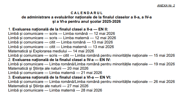 5. Calendarul Evaluării Naționale – clasele a II-a, a IV-a și a VI-a 2026